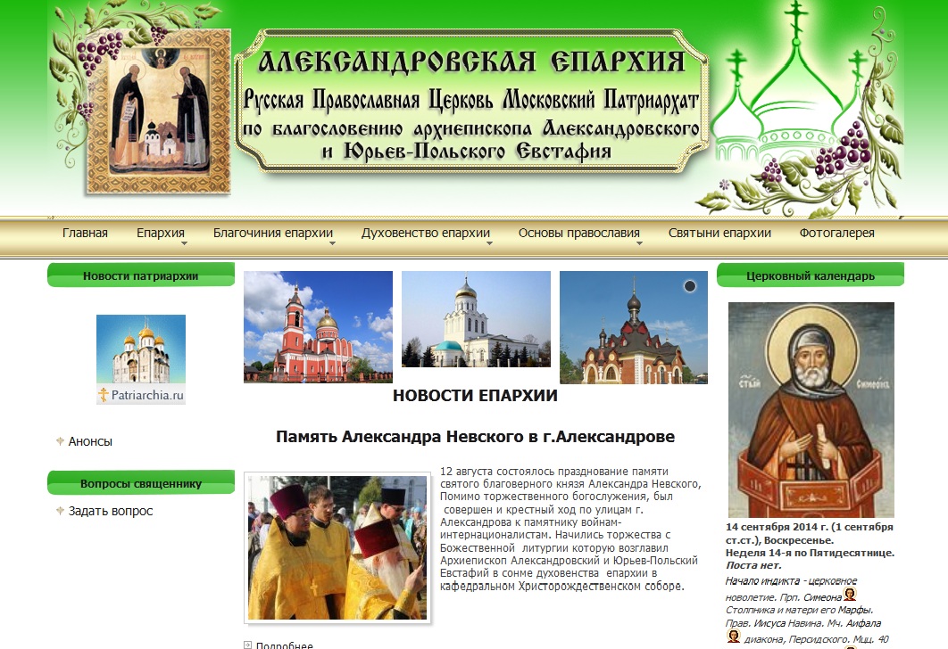 Дорогие братья и сестры! По благословению Высокопреосвященнейшего архиепископа Евстафия начал работу официальный сайт Александровской и Юрьев- Польской епархии Русской Православной Церкви. Сайт доступен по адресу: http://www.alex-u.ru |