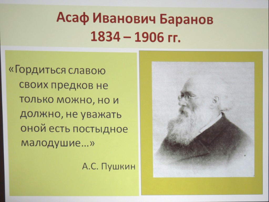 В воскресный день, 8 декабря 2013 года, в трапезной церковного дома Спасо-Преображенского храма города Струнино состоялись I Барановские духовные чтения. Подобное мероприятие проводилось впервые в истории прихода, и было приурочено к престольному празднику преподобного Иоасафа царевича Индийского и предстоящему 180-летию со дня рождения строителя храма, приснопамятного Асафа Ивановича Баранова (1834-1906).