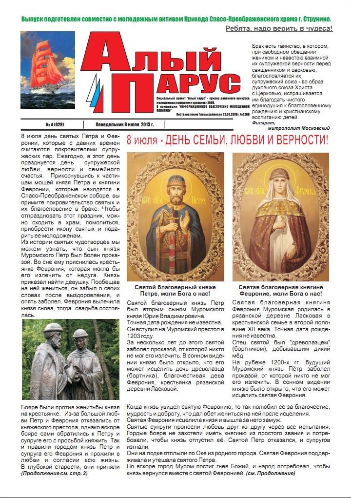 Предлагаем вашему вниманию два выпуска газеты "Алый парус" творческого объединения "Журналистика" Дома детского творчества г. Карабаново, приуроченных к празднованию всероссийского Дня семьи, любви и верности, а также к 1025-летию Крещения Руси. Выпуск газет подготовлен совместно с миссионерским отделом Александровского благочиния и молодежным активом прихода нашего Спасо-Преображенского храма. Вы можете скачать газеты в формате PDF.