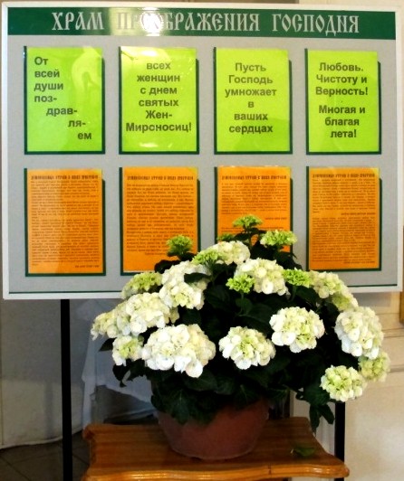19 мая в 2013 году совпало с третьим воскресеньем после Пасхи — Неделей жен-мироносиц. По традиции, этот день празднуют все женщины-христианки, служение которых несет в себе особое, важное и незаменимое значение для семьи и общества. По благословению настоятеля, для каждой из прихожанок в нашем храме после богослужения приготовили цветы и небольшое сладкое угощение. Также состоялся детский Пасхальный праздник в воскресной школе.